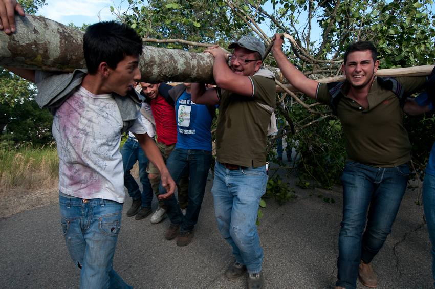 Adrenalina nelle vene. Ingresso in paese. Rotazione nel grande tornante. Ora c’è orgoglio. Voglia di farsi vedere. Comincia il Gran Ballo della Cima’. Quasi un’ora per arrivare in piazza. Botti e fumogeni. Si corre, si torna indietro, si fa balzelli con l’agrifoglio in spalla. Infine si ruota come matti nella piazza. Si sfiorano i paesani. Ci si annoda in un roteare frenetico. Si prende velocità. Gira la testa a seguire le acrobazie dei cimaioli. Si sta in piedi contro ogni fatica. Felicità pura. I ragazzi sono stremati. Lo sposo, il cerro, ha più contegno. Attraversa la piazza con la lentezza del trattore. Se ne va Dietro la Niviera, là dove avverrà il matrimonio. La sposa, l’agrifoglio, rimane in piazza. Viene alzata e puntellata. Passerà l’ultima notte da nubile al centro del paese. La banda riprende a suonare. Un’ultima danza.